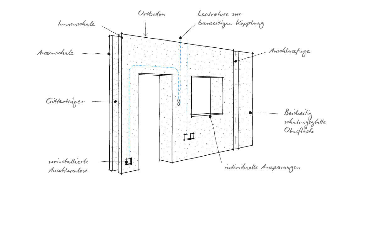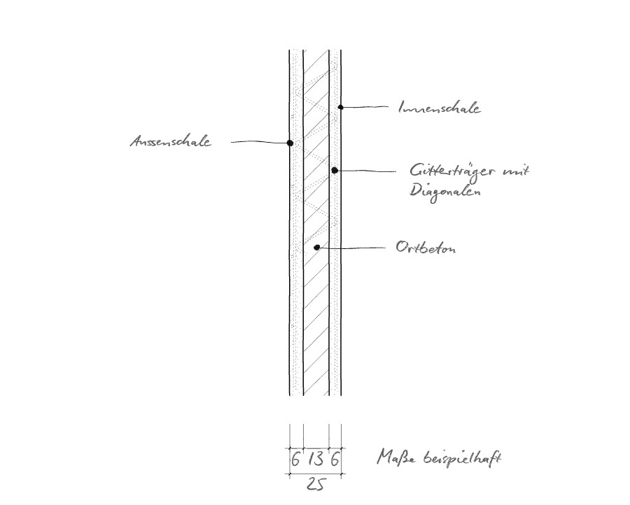 Die Syspro-Doppelwand ist eine massive Wandkonstruktion, die aus zwei durch Gitterträger miteinander verbundenen Stahlbetonschalen besteht. Zwischen den Schalen verbleibt ein Zwischenraum, der nach der Montage mit Ortbeton ausgegossen wird. Sobald der Füllbeton erhärtet ist, wirkt der Gesamtquerschnitt wie eine monolithisch hergestellte Wand.