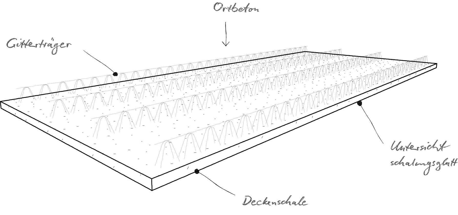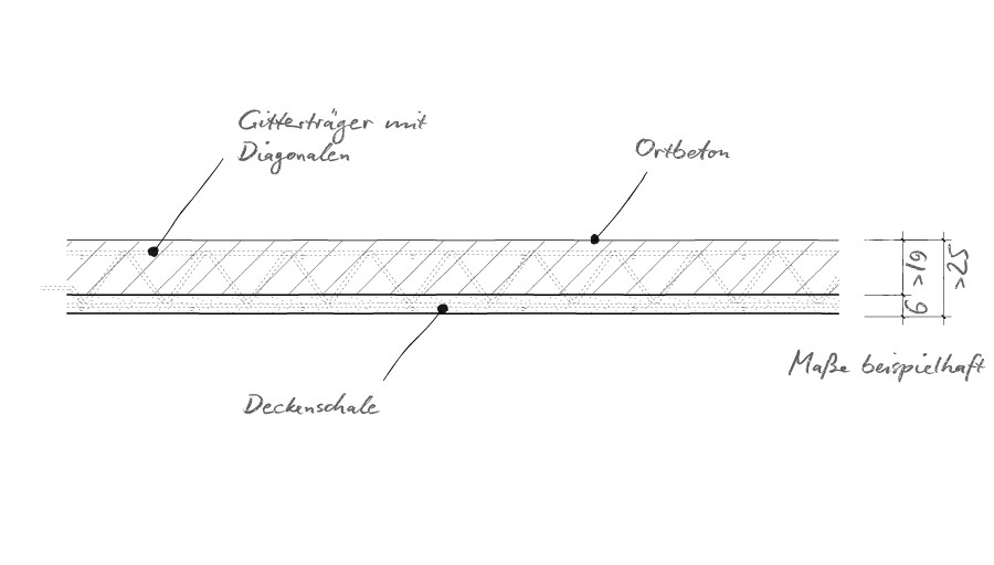 Die Syspro-Elementdecke ist eine Betonfertigplatte mit statisch mitwirkender Ortbetonergänzung. Das vorgefertigte Plattenelement enthält die für die Montagesteifigkeit erforderliche biegesteife Bewehrung in Form von Gitterträgern sowie die für die Montage und den Endzustand notwendige Biegezugbewehrung in Längs- und Querrichtung.