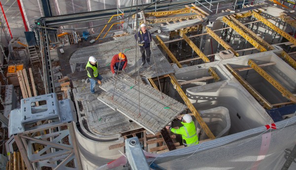 Die Syspro-Klimadecke überzeugt analog zur Syspro-Elementdecke einerseits aufgrund ihrer Wirtschaftlichkeit (keine aufwendigen Schalungsarbeiten bzw. Kosten für Schalungskauf, -transport, -reinigung und -vorhaltung, Klimadeckenelemente werden „just-in-time“ geliefert etc.) im Vergleich zu Ortbetondecken. Die witterungsunabhängige Fertigung im Werk ermöglicht eine hohe Entwurfsfreiheit, Flexibilität und Präzision der Produkte, vor allem wenn aus einer anspruchsvollen Geometrie heraus besondere Anforderungen an die Anordnung und Ausführung von Fugen und Aussparungen vorliegen.