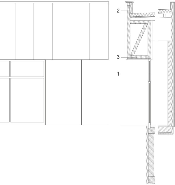 Die Brettschichtholzbinder liegen auf den Wandkronen auf, die hochgezogenen Vorsatzschalen schließen das Dachtragwerk in Wandebene ab.