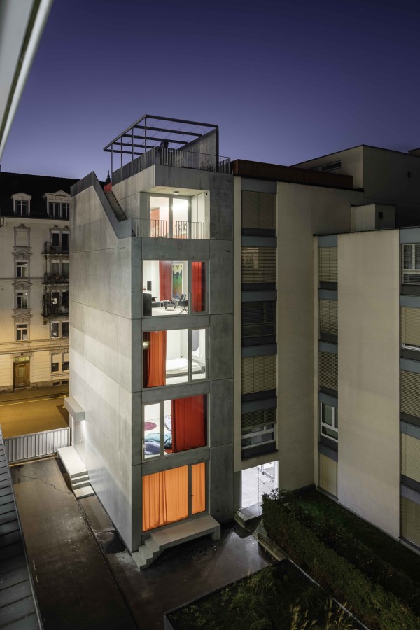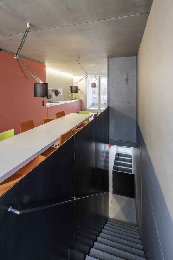 Die vorgefertigten, sichtbar belassenen Betonelemente bilden die Hülle des Hauses. Ihre lebendige graue Oberfläche prägt den architektonischen Ausdruck außen und auch im Inneren. Nach Süden bringt eine bereits werkseitig mit Hartschaum gedämmte, 45 Zentimeter dicke Thermowand mit einem U-Wert von 0.15 den nötigen Wärmeschutz. Zur Brandwand des Bestands hin konnten die Architekten mit Doppelwänden ohne Dämmung anschließen. Die Vollverglasung an den beiden Stirnseiten kommt ohne Jalousien aus. Betontreppen mit vor Ort verschweißten, brünierten Stahlbrüstungen führen ins jeweils nächste Geschoss. Der rohe Stahl und wenige in den Raum gestellte weiße Leichtbau-Kuben sind die einzigen Zäsuren in den weitgehend stützenlosen Flächen. Die Aussteifung des schmalen Gebäudes, das wie alle Bauten in der Schweiz erdbebensicher sein muss, erfolgt über die Betondecken, die ebenfalls Béton brut zeigen. So ist der Bau quasi als „Rohbau“ bewohnbar, auch wenn die gewollte „Ästhetik des Rohen“, so Projektleiter Dennis Matthiesen, dank der Handschrift der Architekten keinerlei Einbußen an Komfort oder Erscheinung zugesteht.