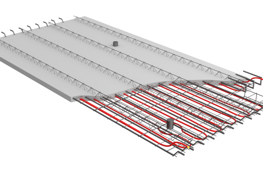 Auch in der Verarbeitung und Montage überzeugt der vorkonfektionierte Baustoff aus dem Hause der Kirchdorfer Gruppe. So enthielt die Klimadecke bereits die für die Montage und den Endzustand erforderliche Biegezugbewehrung in Längs- und Querrichtung. Zusätzlich zu den werkseitig angefertigten Rohrregistern wurden auch beigestellte Module in die Elementdecke integriert.