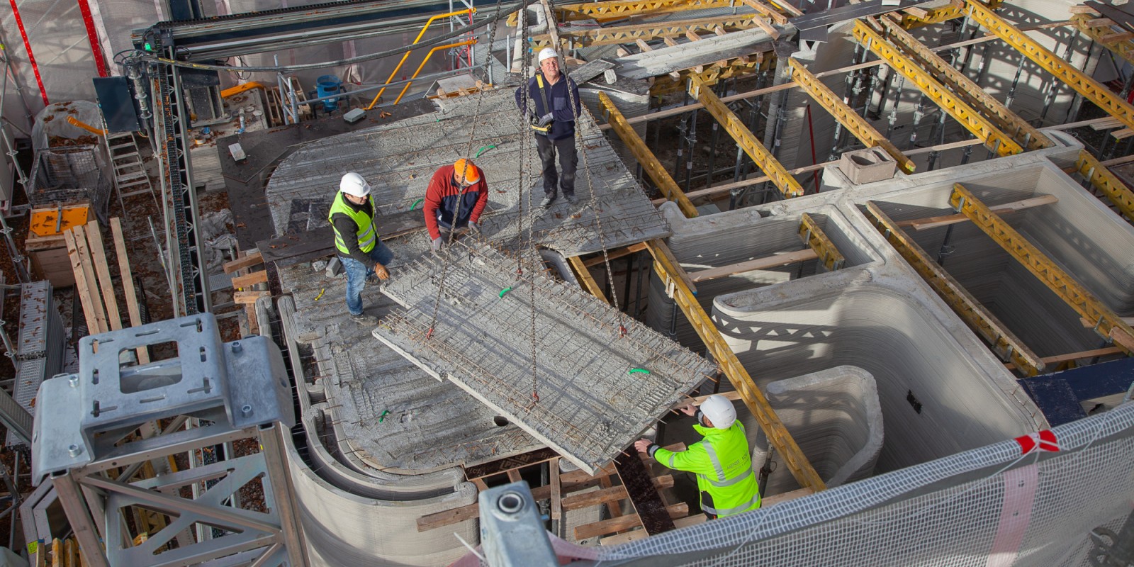 Nach dem Betonieren der Elementdecken sind die Heiz-/Kühlregister vor Baustellenbeschädigungen geschützt (Syspro-Gruppe Betonbauteile)