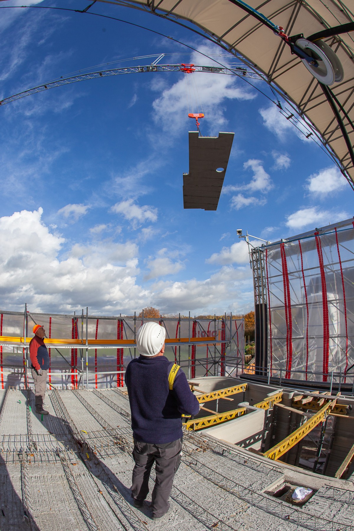 Die exakte Vorfertigung der Deckenelemente sorgte nicht nur für ein Höchstmaß an Passgenauigkeit, sie reduzierte auch die Verlegezeit erheblich. Und auch durch den Wegfall des bauseitigen Verlegens der Rohrsysteme konnte Zeit eingespart werden.