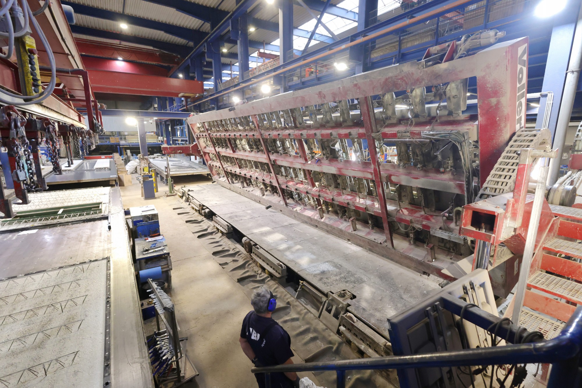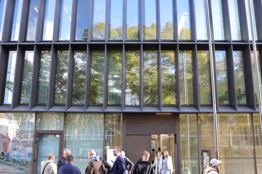 „Und eben weil man mit einer möglichst hohen Zahl an verlässlichen Parametern bauseitig operieren wollte, war die Nutzung unserer Syspro-Klimawände so naheliegend. Die exakt ausführbare Qualität der Bauteile spielte eine große Rolle“, bestätigt Ralf Nienhaus beim Gespräch mit den Medienvertretern im Bedburger Werk. „Im Vergleich zu konventionellen Ortbetonwänden lassen die Doppelwandelemente mit dem auf der Baustelle auszubetonierenden Kern nur ein Minimum an Baufeuchteeintrag zu“, erläutert der technische Leiter das lückenlose Netz an Heiz- und Kühlrohren, das in der gesamten Gebäudehülle je nach Sonnenstand sogar partiell steuerbar ist.