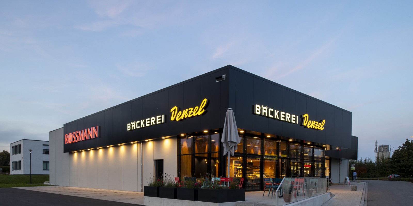 Wie man die Erstellung einer Bäckerfiliale mit einem Drogeriemarkt sinnvoll plant, haben Architekt Marius Mager vom Studio MM in Wangen, Klaus Denzel, Bäckermeister und Inhaber der Bäckerei Denzel in Vogt und der Betonfertigteilehersteller, die Hans Rinninger u. Sohn GmbH u. Co. KG aus Kißlegg im Allgäu gezeigt. Das Geschäftsgebäude mit einer Nutzfläche von 1150 m² im Gewerbegebiet von Vogt beherbergt eine Filiale der Bäckerei Denzel und eine Filiale des Drogeriemarkts Rossmann. Eine mögliche Umnutzung sollte von vornherein berücksichtigt und geplant werden. So entstand die Idee, Beton mit Holz zu kombinieren.