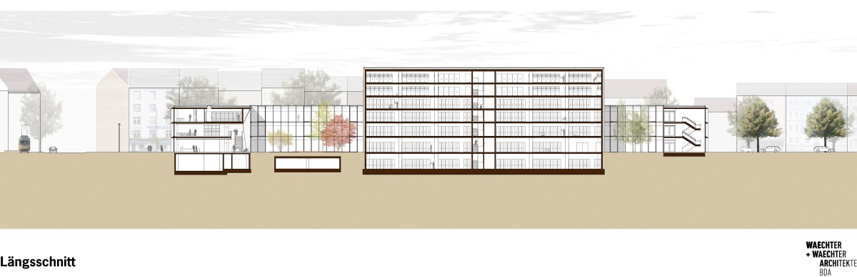 Längsschnitt. Das siebengeschossige Magazin, das „Schatzhaus“, nimmt die eigentlichen Archivräume auf. Hier werden im Hinblick auf die eingelagerten empfindlichen Güter besondere Anforderungen an ein bestimmtes, gleichmäßiges Raumklima gestellt. Das unterirdische Bauwerk in der linken Bildmitte ist ein „Eisspeicher“, Kernstück des innovativen Klimakonzepts.