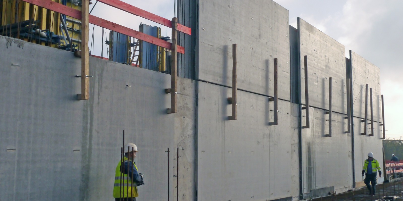 Vor allem die Möglichkeit der Qualitätskontrolle vor dem Betonieren sprach dafür, die Außenwände des Magazins mit Syspro-Doppelwänden auszuführen. Im Vergleich zu Ortbetonwänden ermöglichen die Doppelwandelemente mit dem auf der Baustelle auszubetonierenden Kern zudem ein Minimum an Baufeuchte-Eintrag.