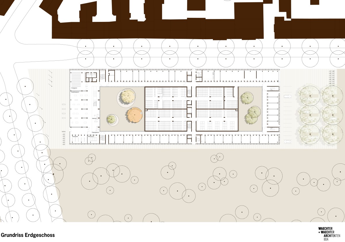 EG: Um das Schatzhaus herum gesellen sich im Mantelgebäude Lesesaal, Ausstellungsraum, Vortragsraum, Büros und Werkstätten sowie zwei begrünte Innenhöfe.