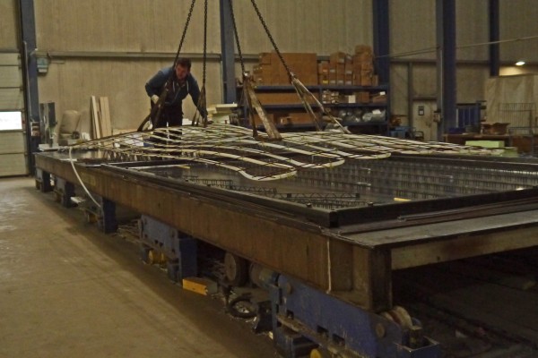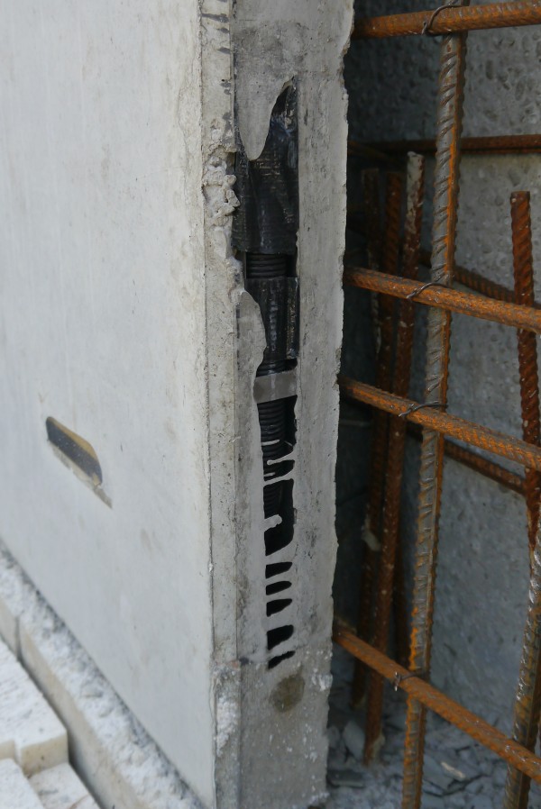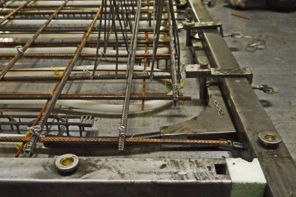 Stichwort: Hüllflächentemperierung: Die – fensterlosen – Hüllwände des Archivs enthalten Rohrschlangen; mit der darin zirkulierenden Flüssigkeit erfolgt die Klimasteuerung. Die Doppelwandelemente werden damit zu Klimawänden. Die 6 cm dicken Innenschalen ergeben eine bündige Wandfläche. Die 8 cm dicken Außenschalen haben Aussparungen, in denen ein Kanal für die senkrecht verlaufenden Anschlussrohre an das Klimasystem geführt wird. Bei der Produktion der Doppelwandelemente kam es darauf an, Durchgängigkeit und Dichtigkeit des eingebauten Rohrsystems beweisbar sicherzustellen.