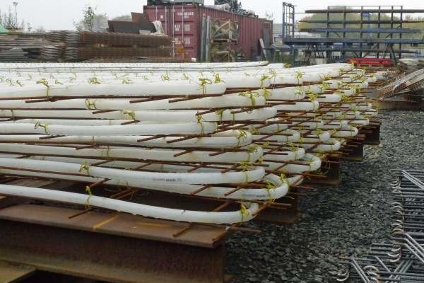 Der Rohbauunternehmer, die Hardfid GmbH, erteilte SySpro-Mitglied Abi-Beton den Auftrag zur systemkonformen Produktion der Klimawandelemente. Systempartner für die Rohrschlangen war Uponor. Um die Auflagen des Bauherren erfüllen zu können, war für viele Detaillösungen individuelle Entwicklungsarbeit zu leisten. So musste z.B. gewährleistet sein, dass abschnittsweise Druckprüfungen vorgenommen werden können. Auch für die Zugänglichkeit der Rohrsysteme nach dem Betonieren auf der Baustelle mussten konstruktive Feinheiten erdacht werden. Ferner hat Abi-Beton spezielle Blechkästen entwickelt, um die spätere Anbindung der Rohrsysteme an die Steigleitung zu ermöglichen. Produziert wurden die Wandelemente geschossweise nach Baufortschritt im Werk Bedburg. Die ersten Elemente wurden im August ausgeliefert, die letzten im Januar 2018. Insgesamt lieferte Abi-Beton 2.830 m2 Wandelemente. Die Klimawände haben eine Wanddicke von 30 cm. Die Druckprüfungen auf der Baustelle sind erfolgreich verlaufen.