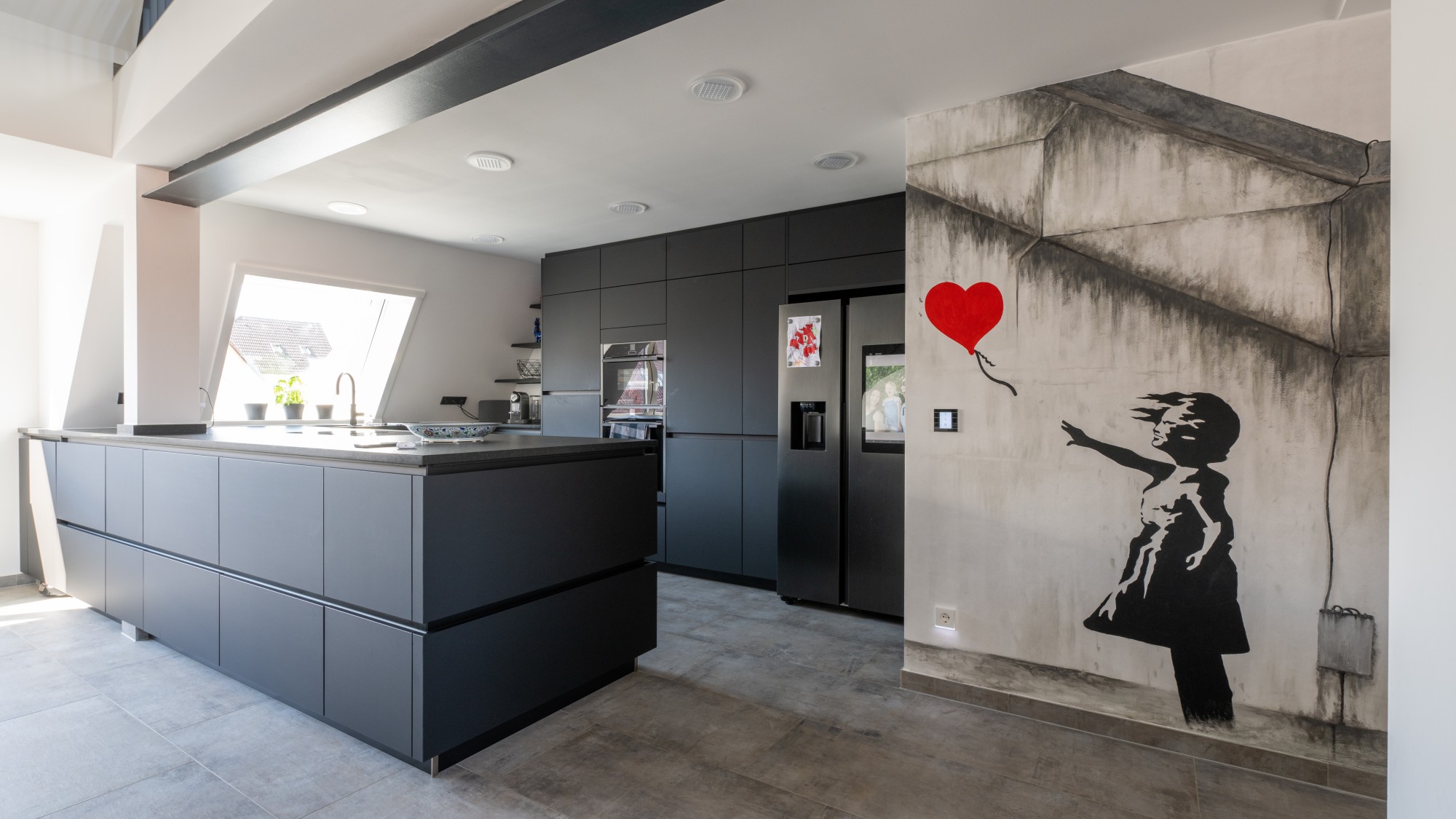 Klare Linien, offene Flächen mit ein wenig Shabby-Look und Banksy-Art – die Inneneinrichtung des neuen Hauses der Familie Freund hat keine traditionellen Anlehnungen. Foto: Michael Mesick