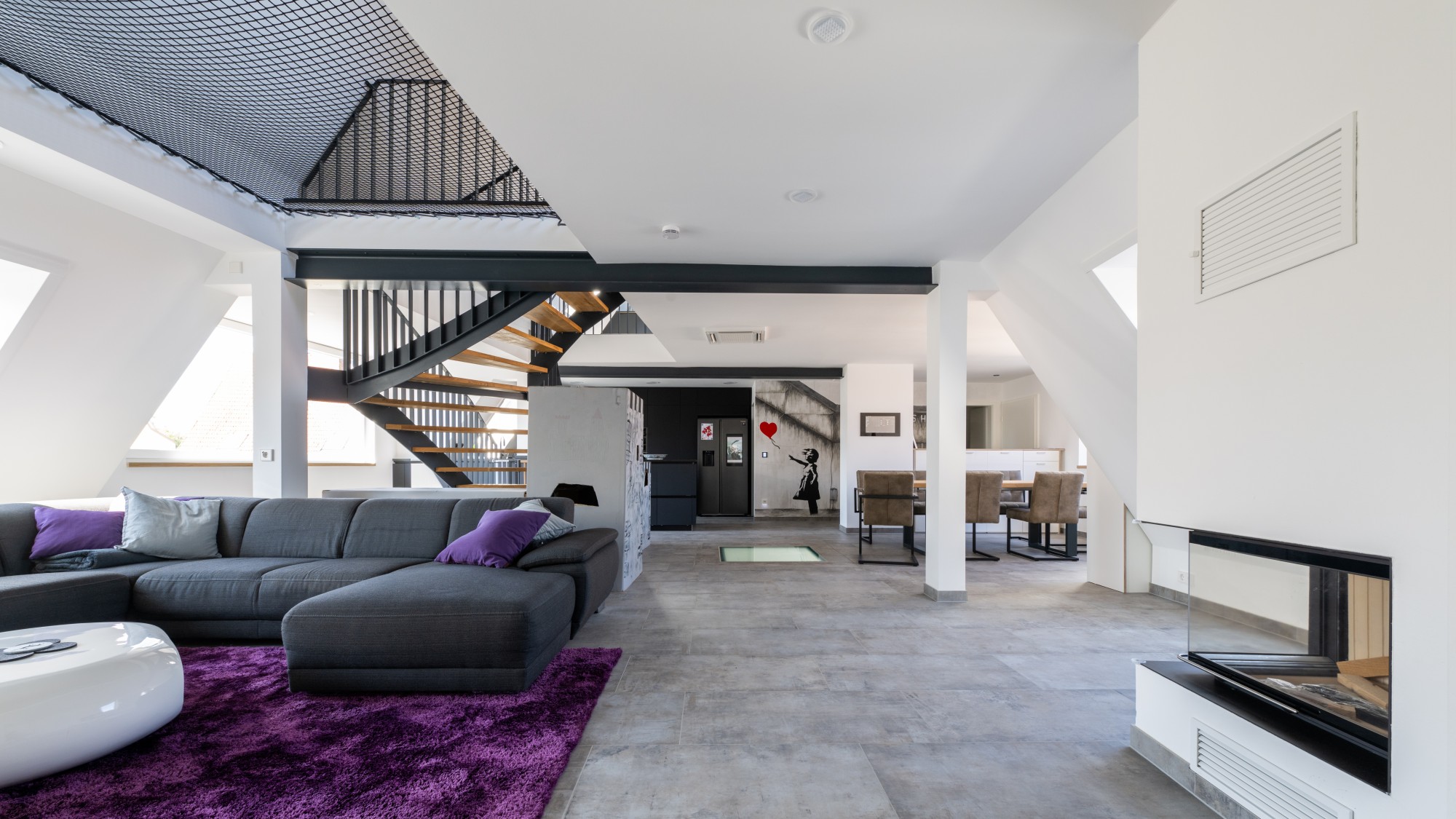 Hell, groß und offen: In die Dachgeschosse ist Familie Freund im Jahr 2021 eingezogen. Rechts der Kamin, der auch eine Wassertasche zur Versorgung mit Brauchwasser beheizen kann. Foto: Michael Mesick