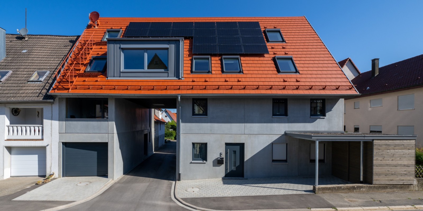 In die oberen beiden Dachgeschosse und damit in den eigentlichen Wohnbereich der Familie Freund gelangt man über den linken Eingang von der Tunneleinfahrt aus. „Im Erdgeschoss haben wir hier noch eine Garage und im ersten Stockwerk ein Gästezimmer. Von hier aus führt eine Betontreppe in die Dachgeschosse, wo wir wohnen. Die dritte Etage verfügt über einen großen, offenen Küchen- und Wohnzimmerbereich sowie ein separates Kinderzimmer“, erklärt Alexander Freund die Raumaufteilung.