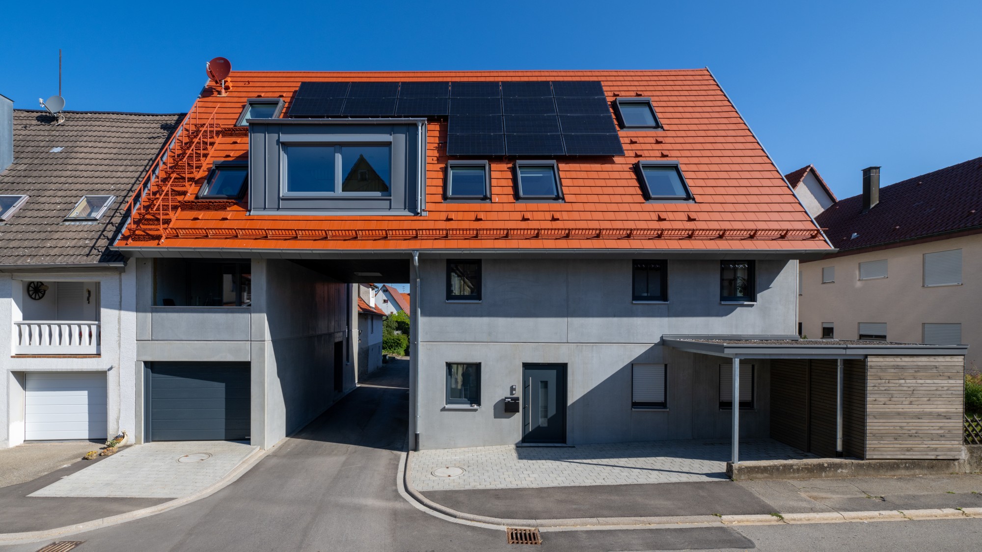 Die Nachbarn aus dem Ort seien am Anfang die allergrößten Kritiker dieses besonderen Bauprojektes gewesen, berichtet der Bauherr. „Vom „Betonbunker“ war die Rede und dem „hässlichsten Haus der Dorfgeschichte“, erzählt der Handwerker. Ein Umdenken kam dann während des eigentlichen Hausaufbaus. Gerade mal vier Tage brauchte man mit einem Bau- und einem Autokran, um die vorgefertigten Teile auf die Fundamentplatte zu setzen. „Für jedes Geschoss brauchten wir jeweils einen Tag. Als dann alles stand, gab es den Wow-Effekt: Wir haben nur Lob bekommen.“ „Richtig geil“ finden die Leute inzwischen das neue Haus, in das Alexander Freund rund 1,3 Millionen Euro investiert hat. Mit 100.000 Euro hat das Land Baden-Württemberg die Besonderheit mit dem „Entwicklungsprogramm ländlicher Raum“ zudem noch gefördert. Die gesamte Investitionssumme setzt Marketing-Leiter Frank Fletschner indes noch etwas höher an: „Alex hat eine Menge Eigenleistung für den Technikbau mit eingebracht. Unterm Strich dürfte das Investitionsvolumen für dieses Projekt tatsächlich um die 2 Millionen Euro liegen.“