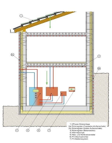 Im Rahmen eines AiF-Förderprojektes wurde ein System zum Beheizen von Gebäuden entwickelt. Dabei steht die multifunktionale Nutzung von Betonbauteilen im Fokus. Durch eine clevere Steuerung von solaren und geothermischen Kollektorerträgen ist eine wirtschaftliche Anwendung des Systems bis hin zum Plushaus möglich. Derzeit werden verschiedene Ausbaustufen dieses Energiekonzeptes im Hinblick auf die EnEV und KfW-Standards untersucht, in dessen Folge die Wirtschaftlichkeit detailliert bewertet werden kann. Jüngste Erkenntnisse zu Vorteilen bei der Umsetzung von Kellergeschossen nach EnEV 2016 sollen hierbei ebenso einfließen.