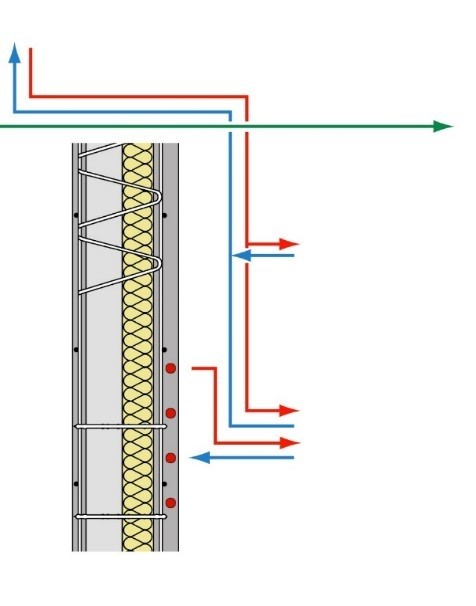 Die Firma Ragano hat das bewährte Produkt nun weiterentwickelt, indem im Werk unter der Betonoberfläche zusätzlich ein Rohrleitungsnetz für eine energetische Nutzung eingelegt wird. Nach der Fertigstellung des Gebäudes zirkuliert in den Kunststoffrohren ein Gemisch aus Wasser und Frostschutzmittel. Sind diese Thermowände mit eingebauten Rohrleitungen zum Beispiel ein Teil der Fassade, funktionieren sie als Absorber für solare Wärme. Werden die aktivierten Thermowände hingegen im Bereich der Frostschürze verbaut, lässt sich die Erdwärme nutzen. Grundsätzlich funktioniert das System der aktivierten Betonbauteile so: Eine Wärmepumpe entzieht dem Flüssigkeitskreislauf in den Kunststoffrohren kontinuierlich Wärmeenergie, um sie zur Gebäudeklimatisierung heranzuziehen. Dadurch sinkt die Temperatur der Absorberfläche unter die Temperatur der Umgebungsluft bzw. des Erdreiches, sodass sie wieder neue Energie aus der Umgebung aufnehmen kann. Bei einer Kombination dieses Heiz- und Kühlsystems mit einer Photovoltaikanlage ist sogar der Strombedarf zum Betrieb der Wärmepumpe weitgehend gedeckt, somit ist ein energetisch autarkes Gebäude mit diesem System realisierbar.