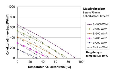 Bei laufender Wärmepumpe kühlt sich die Außenschale um etwa 3 bis 5 Kelvin unter die Temperatur der Außenluft ab. Unter durchschnittlichen Bedingungen nimmt die Absorberfläche einen Energiestrom von etwa 90 Watt je Quadratmeter aus der Umwelt auf. Bei diffuser oder direkter Sonneneinstrahlung erhöht sich dieser Energiestrom um ein Vielfaches. Dieser Wert erreicht die Größenordnung von konventionellen Absorbern, die z. B. für 35° Dachneigung und Südausrichtung bei 25 °C Übertemperatur etwa 500 kWh/ m2a liegen können. Die Wirtschaftlichkeit des Systems wird entscheidend durch eine sorgfältige Abstimmung von Gebäudewärmeschutz, Größe, Lage und Ausbildung der Absorberflächen, Gebäudeheizung und der technischen Ausstattung bestimmt. Wichtige Einflüsse sind zudem die Ausrichtung (Nord-Süd), die Farbe der Betonoberfläche und das Strahlungsangebot/Klima. Im Winter ist der Sicherheitsabstand zum Taupunkt wichtig, um den Wärmeertrag zu maximieren. Der Wärmeträgerkreislauf wird mit konstanter, möglichst niedriger Eintrittstemperatur betrieben, so lange wie die Wandtemperatur über dem Taupunkt der Umgebungsluft liegt. Ergibt sich dabei eine Abkühlung der Wandoberfläche bis zum Taupunkt, ist die Temperatur des Wärmeträgers vorsichtig so zu erhöhen, dass die Wandtemperatur nicht unter den Taupunkt absinkt.