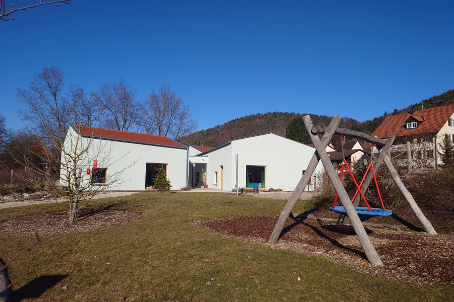 Seit Spätsommer 2020 werden im „Dörfle am Bach“, unter der Leitung der Erzieherin Evelyne Honer 60 Kinder im Alter von ein bis sechs Jahren in zwei Gruppen und einer Krippe (0 bis 3 Jahre) betreut. Die Kita wird mit Nahwärme aus einer kommunalen Holzhackschnitzel-Heizzentrale versorgt. Der Neubau erfüllt die gesetzlichen Vorgaben nach der Erneuerbare-Energien-Verordnung und steht auf einer 2.500 m² großen Grünfläche, auf der die Außenspielstätten als Naturgärten angelegt sind.