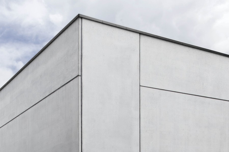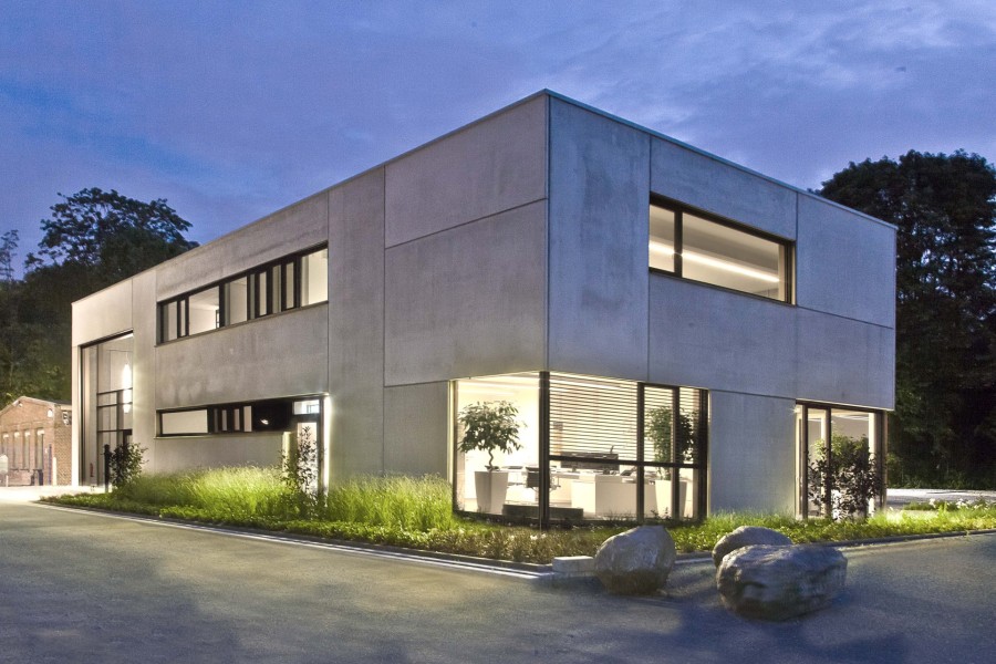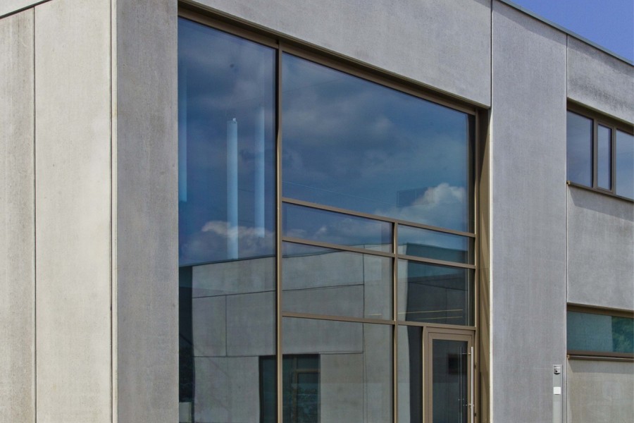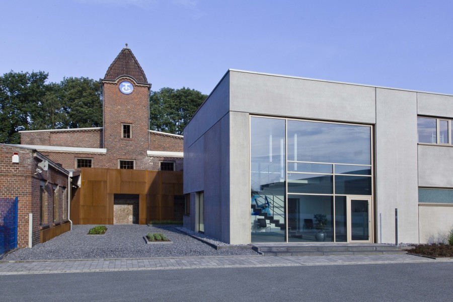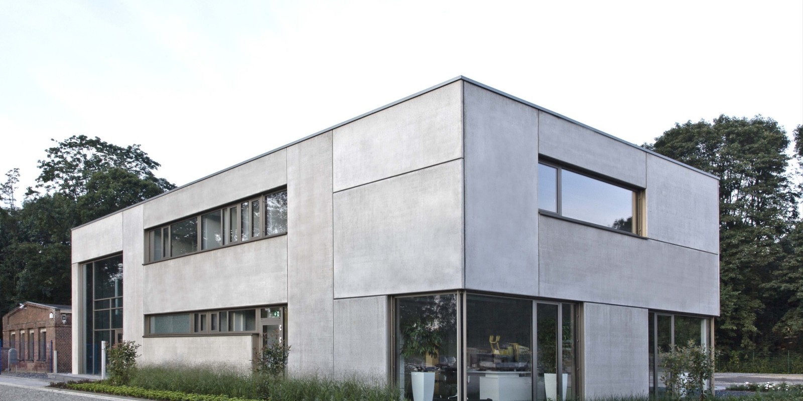 Gebäudekombination aus dem mit Syspro-Elementen gestalteten Neubau mit dem Bestandsbau eines ehemaligen Kohlenzechengebäudes. Roh belassener Sichtbeton steht heute hier als klar gliederndes Fassadenmaterial im Vordergrund und sorgt für den gewünschten Dialog zum historischen, industriellen Umfeld.